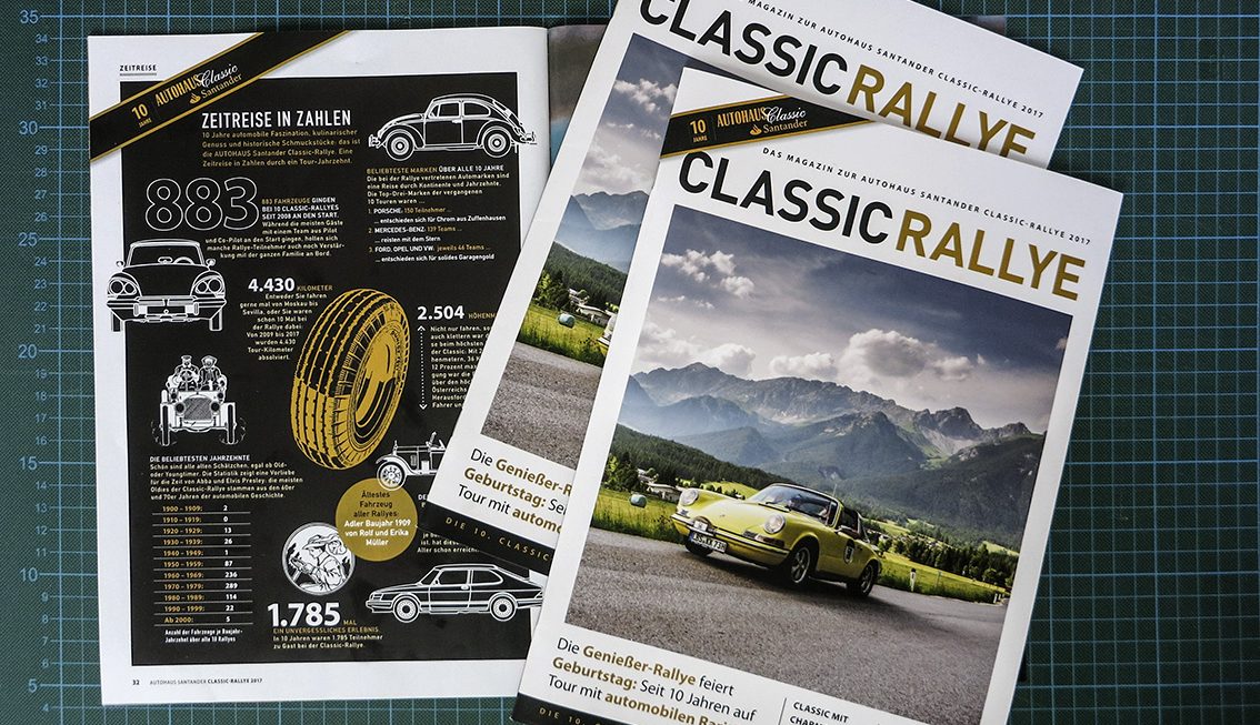 AUTOHAUS CLASSIC RALLYE. Einmal im Jahr muss das Teamwork 100-prozentig funktionieren. Dann produzieren wir mit der Redaktion Autohaus ein Magazin in Echtzeit: das heißt während die Oldtimer Rallye stattfindet, fotografieren, texten und layouten wir eine Zeitschrift. In der Nacht wird gedruckt und beim Abschied liegt das Heft für die Teilnehmer auf dem Frühstückstisch. Beste Teamarbeit!